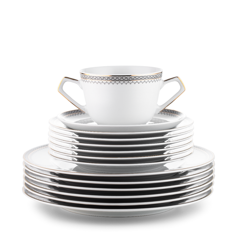Naczynie zachwyca delikatnym złotym ornamentem inspirowanym greckim ornamentem, który nadaje mu luksusowy i wyrafinowany wygląd. To doskonały wybór dla osób ceniących ponadczasową elegancję, wysoką jakość wykonania i funkcjonalność w codziennym użytkowaniu.