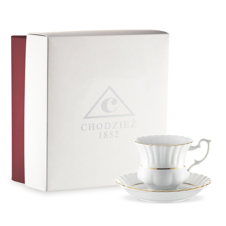 Filiżanka odlewana ze spodkiem z serii Iwona B014 to wyjątkowe połączenie tradycyjnego wzornictwa i wyrafinowanej formy. Jej charakterystyczny, lekko zaokrąglony kształt i subtelnie falowany rant nawiązują do stylu retro, a złoty pasek dodaje całości szlachetnego, odświętnego blasku. Wykonana z wysokiej jakości porcelany, z dbałością o detal, zachwyca lekkością i elegancją – zarówno w dłoni, jak i na stole.