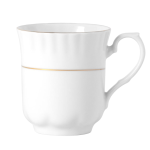 Wykonany z najwyższej jakości porcelany, ten elegancki kubek charakteryzuje się subtelnym zdobieniem i delikatnym złotym paskiem, który nadaje mu luksusowy charakter.
