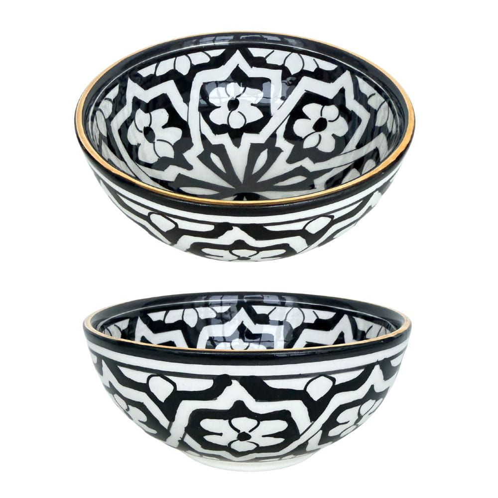 Miseczka 13,5 cm Fassia Black Gold Chabi Chic to elegancki i funkcjonalny element luksusowej zastawy stołowej, inspirowany marokańskim rzemiosłem artystycznym. Głęboka czerń ceramiki została wzbogacona charakterystycznym geometrycznym wzorem Fassia oraz subtelnymi detalami z prawdziwego złota, tworząc wyjątkową oprawę do serwowania przekąsek, dodatków, deserów czy sosów.