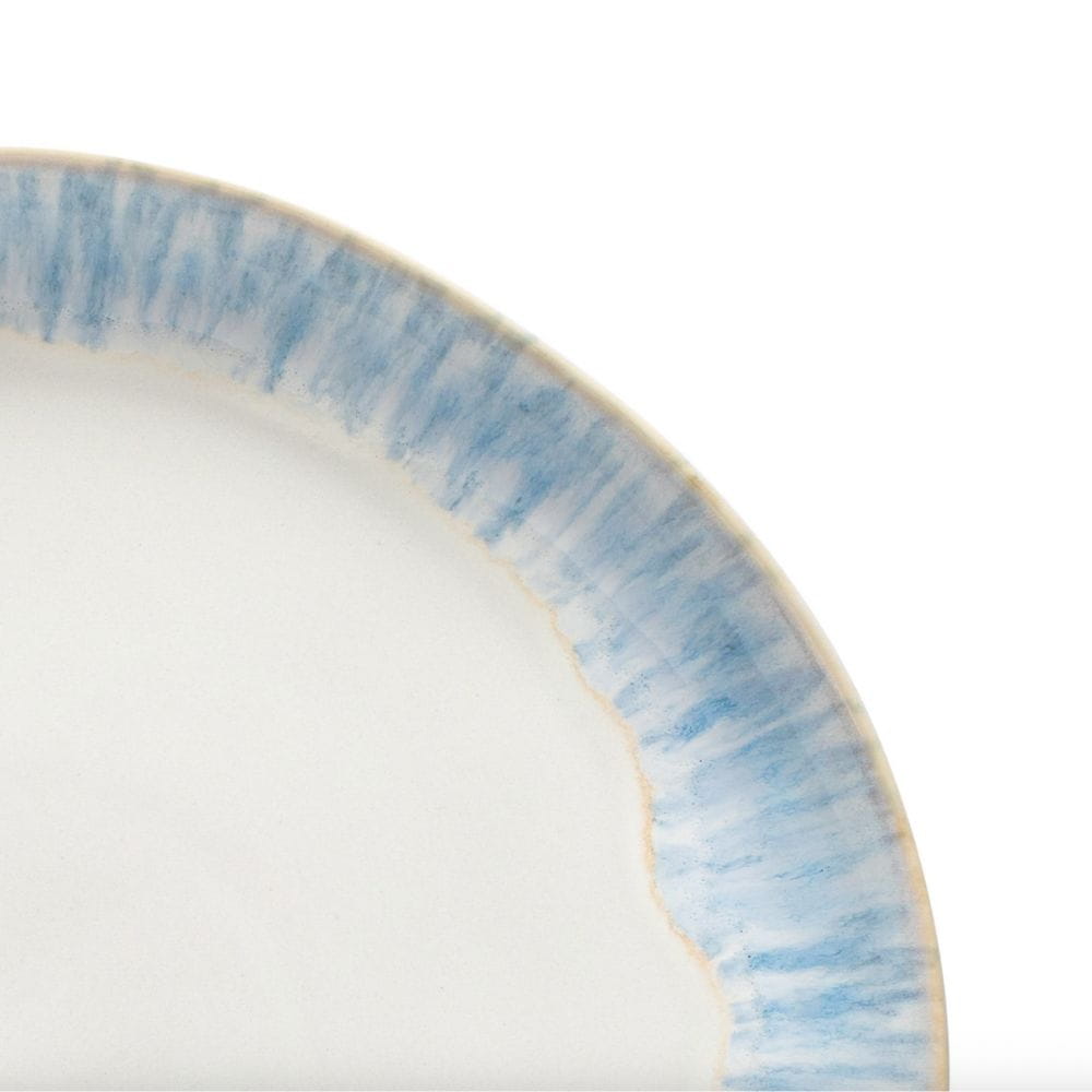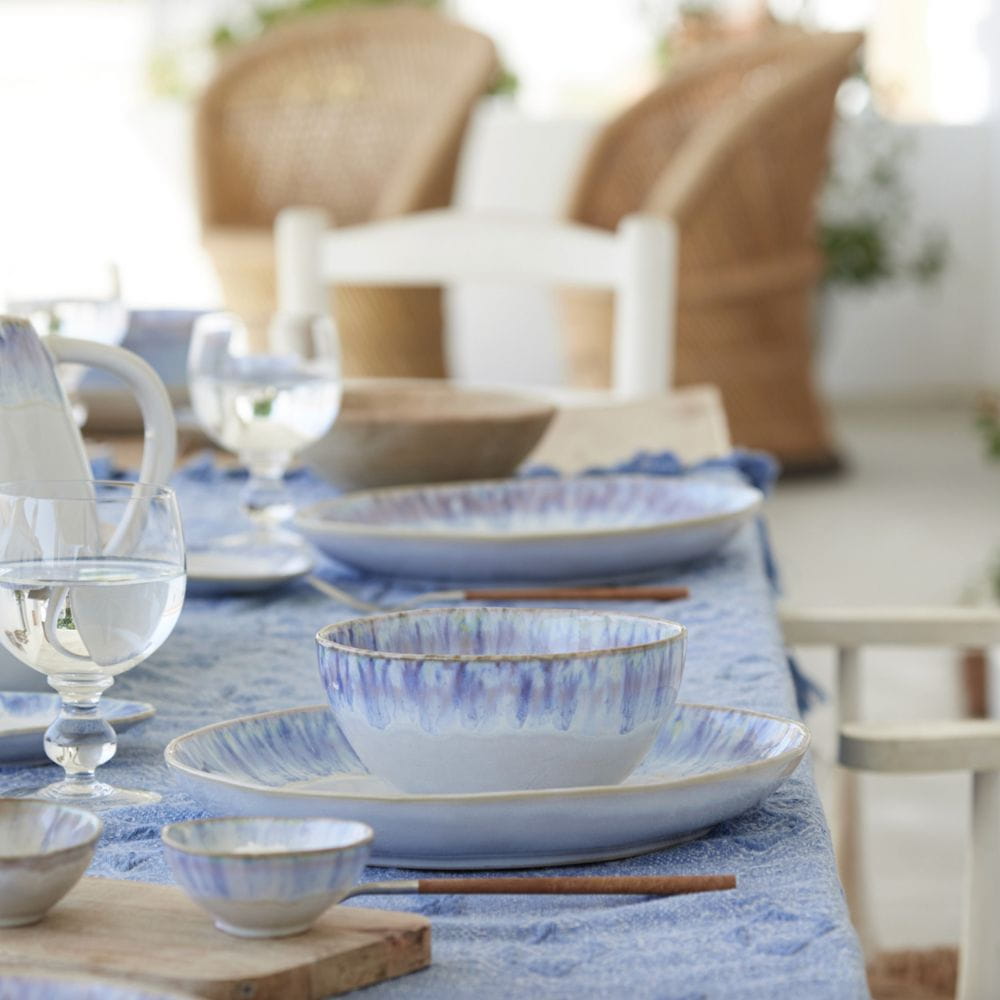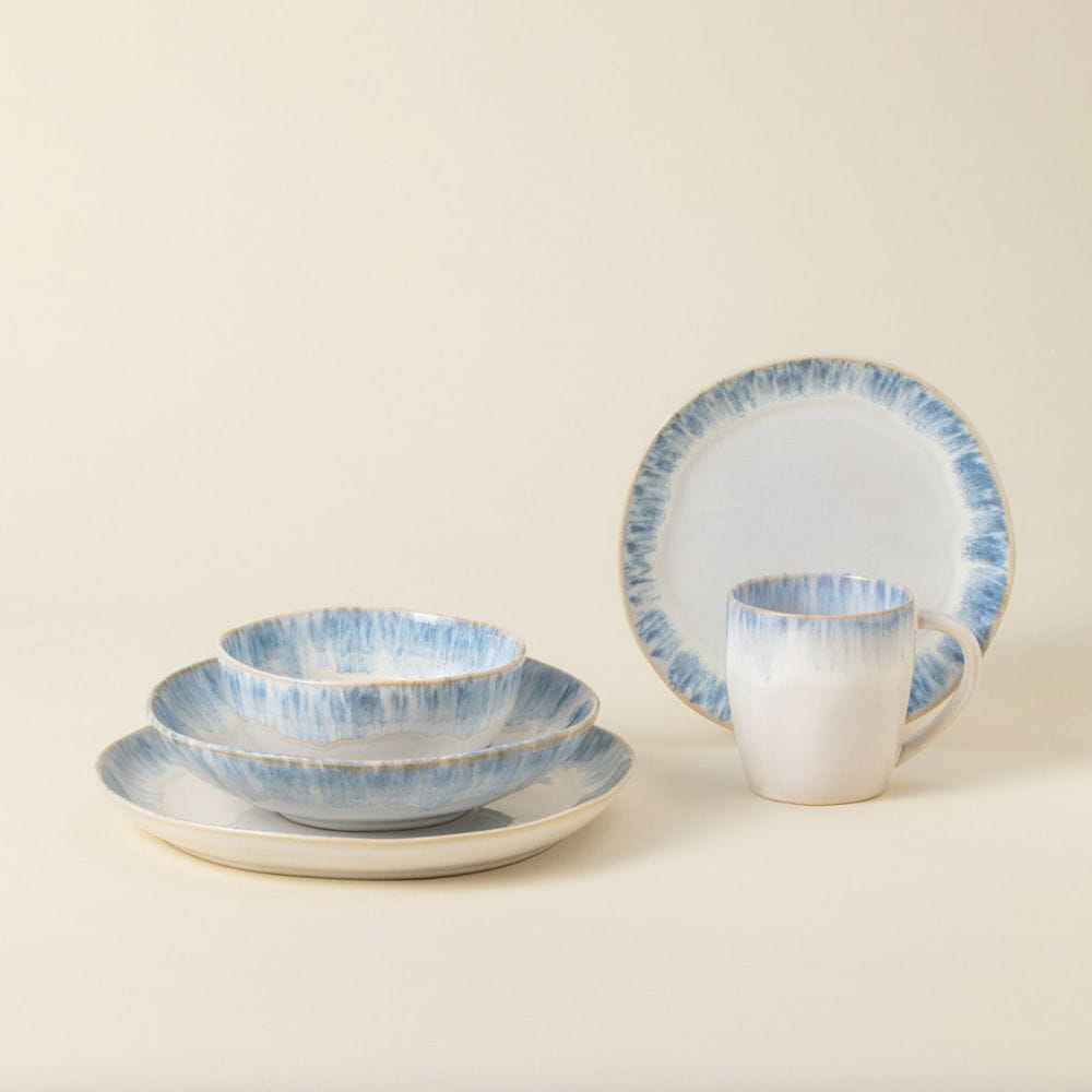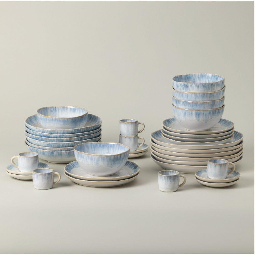 Każdy element zestawu wyróżnia się delikatnym szkliwem w odcieniach morskiego błękitu i piaskowej bieli, które przywodzą na myśl spokojne fale oceanu oraz letnie niebo nad portugalską zatoką Ria de Aveiro. Serwis wykonany jest z trwałej, wysokiej jakości kamionki – odpornej na codzienne użytkowanie i bezpiecznej do zmywarki, mikrofalówki oraz piekarnika.