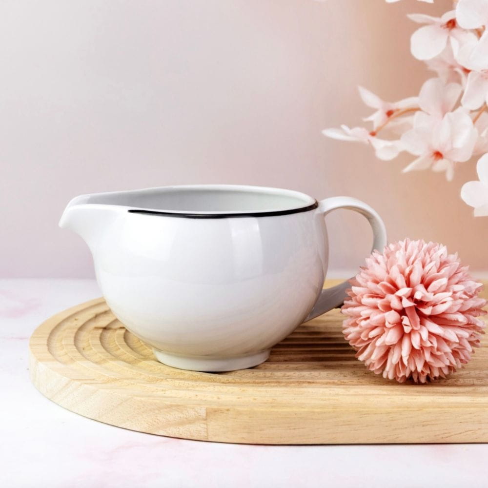 Doskonała w połączeniu z talerzykami, miseczkami i filiżankami z tej samej kolekcji, tworzy spójną i elegancką zastawę stołową. Sosjerka Czarny Rant Waza to funkcjonalny element stołu, który jednocześnie podkreśla wyrafinowany styl Twojej aranżacji i wzbogaca estetykę podawanych potraw.