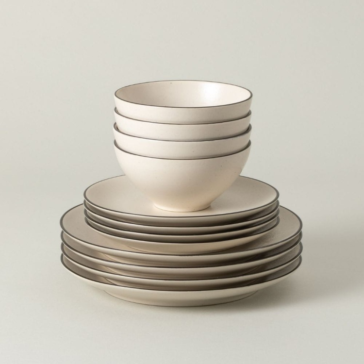12-częściowy zestaw obiadowy Costa Nova AUGUSTA to harmonijne połączenie nowoczesnego designu, naturalnej elegancji i najwyższej jakości wykonania. Stworzony z wytrzymałej kamionki i ręcznie szkliwiony w Portugalii, zestaw prezentuje się wyjątkowo dzięki matowemu beżowemu wykończeniu oraz delikatnej czarnej lub złotej obwódce, charakterystycznej dla kolekcji AUGUSTA.